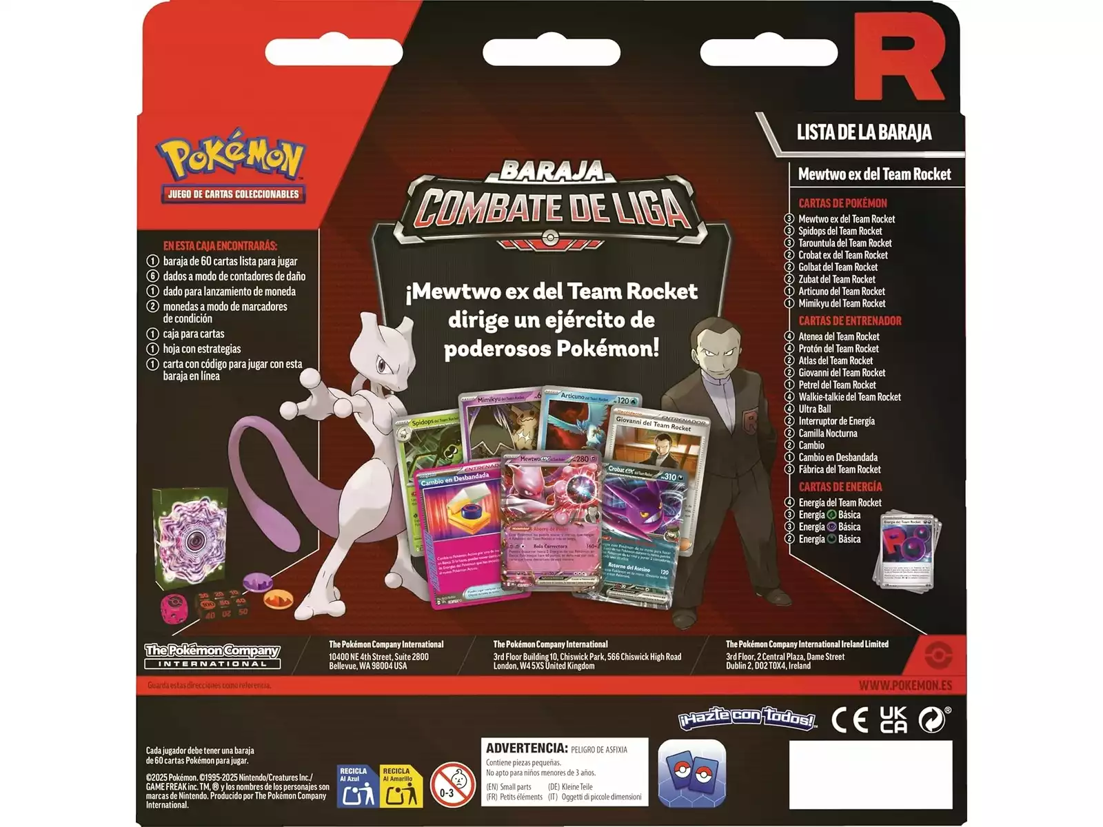 • 1 blíster con 1 baraja con 60 cartas de juego coleccionables entre las que se incluyen 3 cartas holográficas de Mewtwo EX del Team Rocket